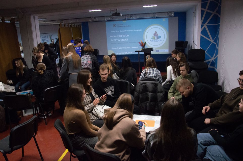 26 листопада 2026 року у Донецькому національному університеті імені Василя Стуса відбувся захід для молоді “DonNU-FREEGOOD MEET&GREET” в рамках реалізації проєкту програми ЄС Еразмус+ напряму Жан Моне «Свобода руху товарів, послуг та осіб: досвід ЄС для України» [FREEGOOD]