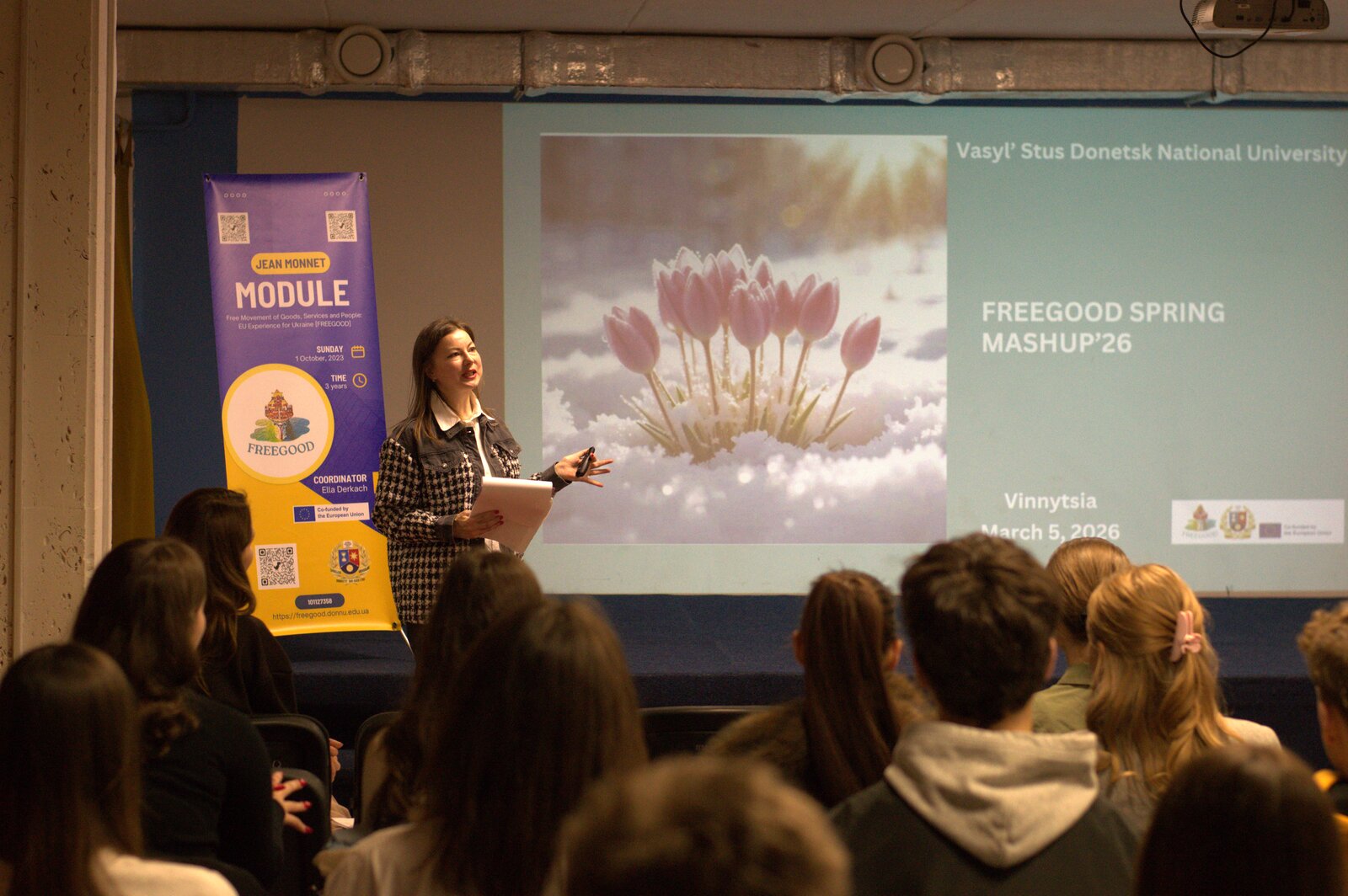 5 березня 2026 року відбувся захід FREEGOOD SPRING MASHUP’26 в рамках проєкту напряму Жан Моне Еразмус+ “Свобода руху товарів, послуг та осіб: досвід ЄС для України” [FREEGOOD] ERASMUS-JMO-2023-HEI-TCH-RSCH, що реалізується з 1 жовтня 2023 року у Донецькому національному університеті імені Василя Стуса, у співпраці з Асоціацією жінок-юристок України “ЮрФем” та ГО “Ліга студентів Асоціації правників України”.