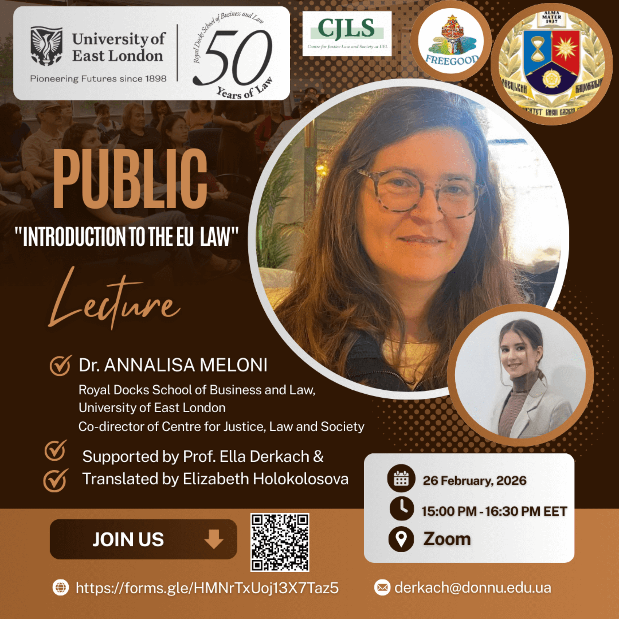 🌐 Радо запрошуємо Вас взяти участь у відкритій лекції “Вступ до права ЄС”, що проводитиметься Dr. Annalisa Meloni, University of East London Co-director of Centre for Justice, Law and Society (Великобританія)